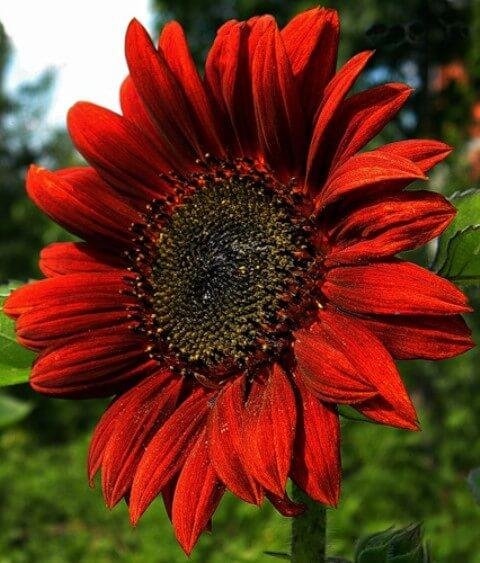 Однорічна рослина з товстими, потужними стеблами, висотою 150-200 см. Суцвіття-кошики великі, діаметром 15-20 см з пелюстками інтенсивно-червоного забарвлення та чорною серцевиною. Вирощується посівом насіння у відкритий ґрунт по 2-3 насінини в лунку, на відстані 30-50 см. Соняшник використовують у групових посадках при декоруванні стін та огорож, зрізані суцвіття чудово виглядають у букетах.