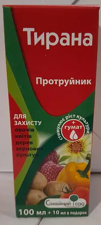 Вага 100 мл.+10мл.Тирана – є протравлювачем інсекто-фунгіцидної дії. Призначений для обробки насіння і садивного матеріалу з метою захисту від шкідників і грибкових захворювань.